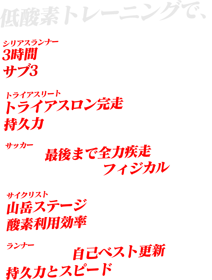 適切な低酸素環境下でのトレーニングは、身体の酸素利用効率を高め、様々な面でパフォーマンス向上をもたらします。
