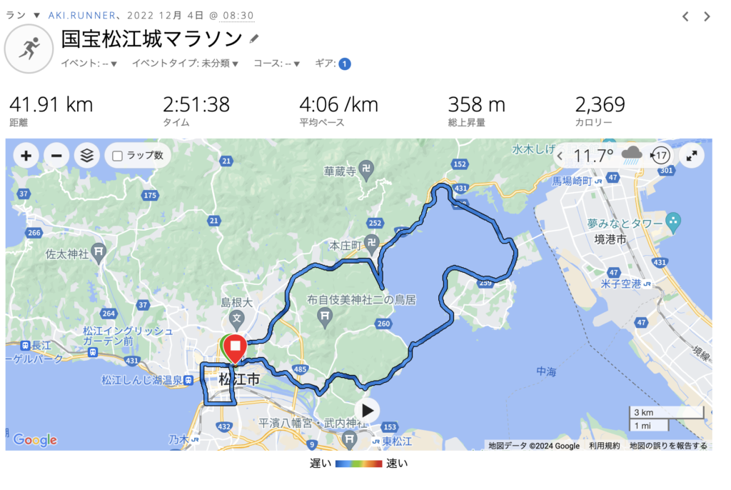 - 中盤: 宍道湖沿いの絶景コース 平坦なコースが続き、宍道湖の美しい景色を楽しみながら、リズムを作ることが重要です。ペースを維持しやすいので、中盤での体力管理が攻略のカギです。