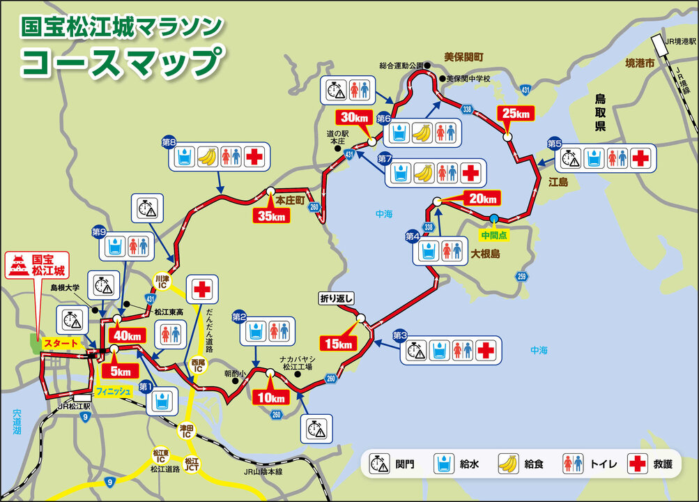 - スタート地点: 総合体育館、松江城、宍道湖を歴史を感じながら、松江の街を走り出します。